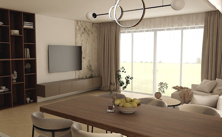 Wnętrze salonu z drewnianym stołem i telewizorem