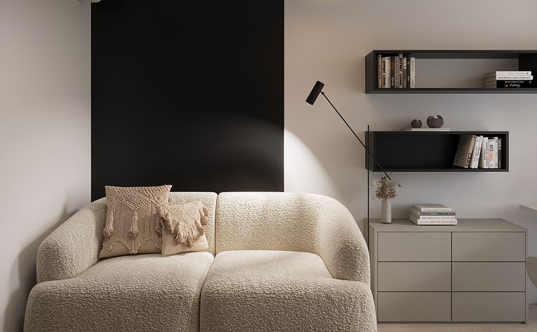 Salon z jasną sofą i czarną ścianą
