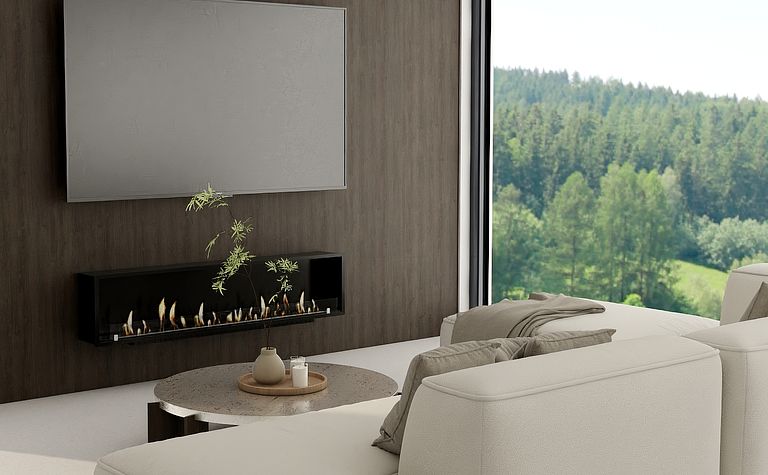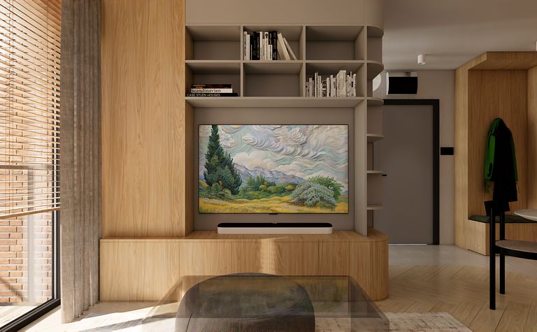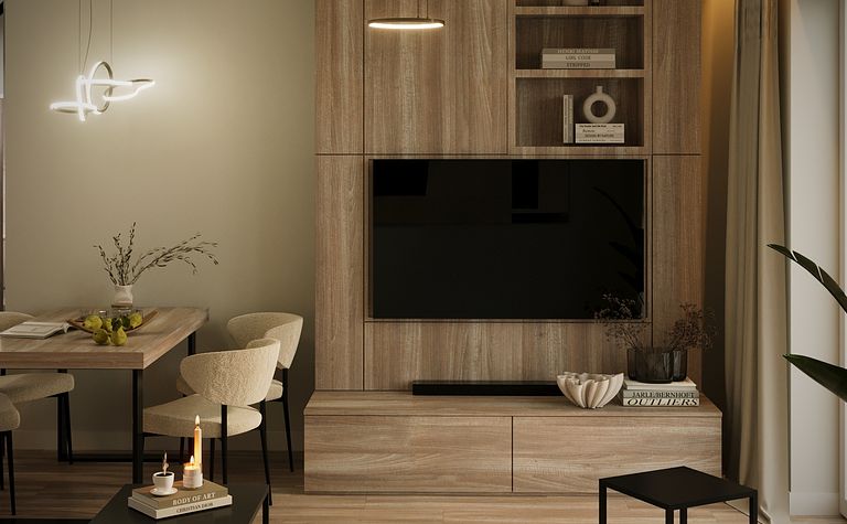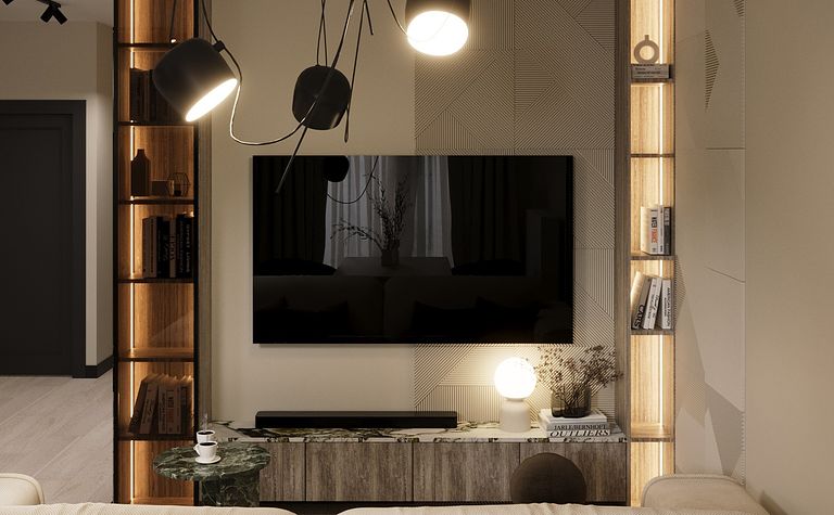 Wnętrze salonu z drewnianą półką i telewizorem
