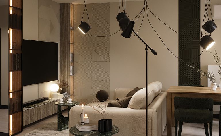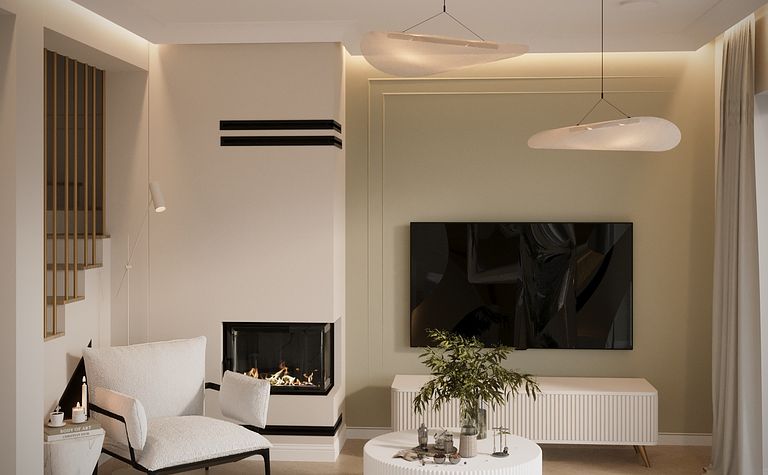 Salon z telewizorem i nowoczesnymi lampami