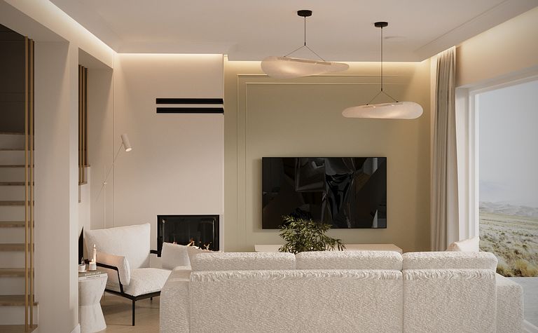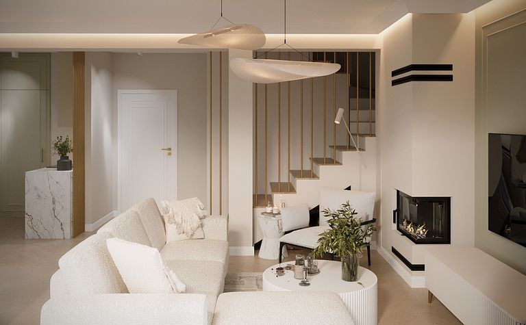 Salon z białą sofą i kominkiem