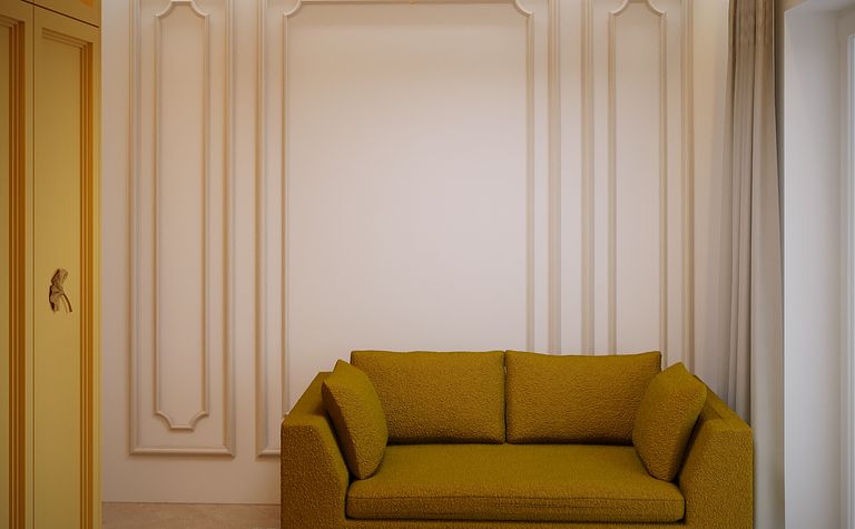 Salon z żółtą sofą i jasnymi ścianami