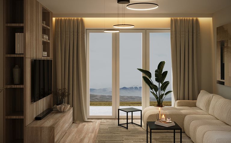 Salon z jasnymi meblami i dużymi oknami
