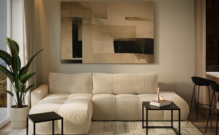 Salon z beżową sofą i czarnymi akcentami