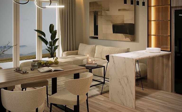 Salon z jasną sofą i drewnianym stołem