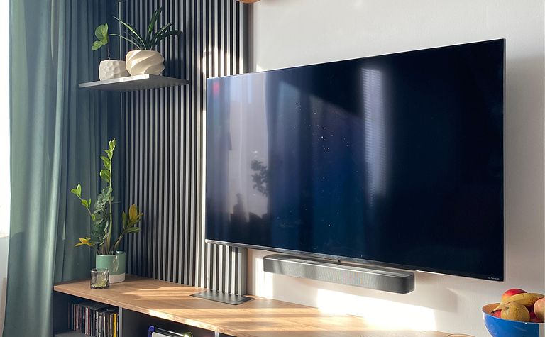 Wnętrze salonu z telewizorem i roślinami
