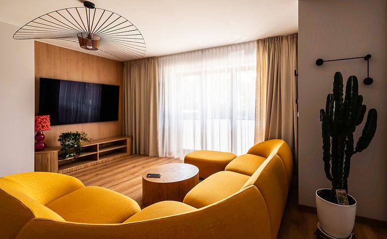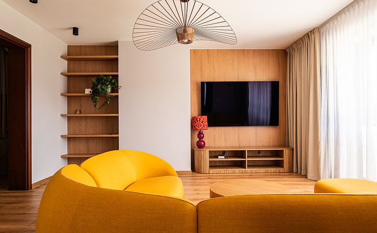 Salon z żółtą sofą i drewnianymi akcentami