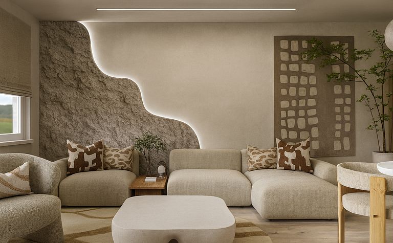 Salon z beżowymi meblami i szarym oświetleniem