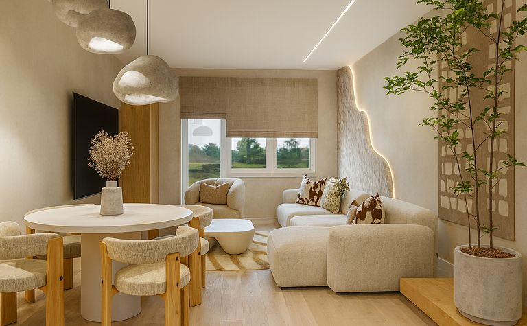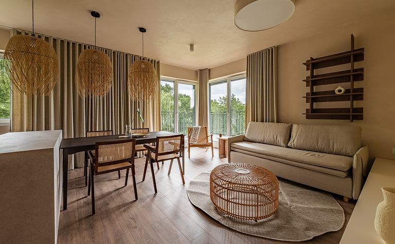 Salon z jasnymi meblami i drewnianym stołem
