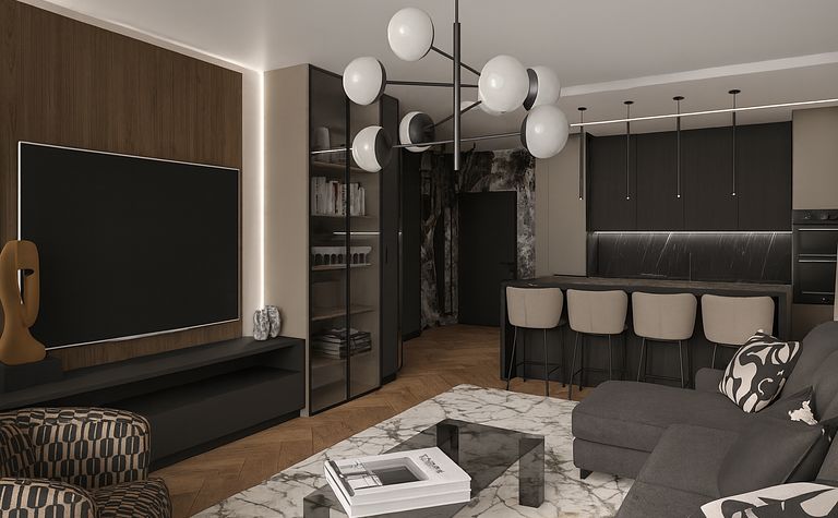 Salon z szarym narożnikiem i marmurowym stołem