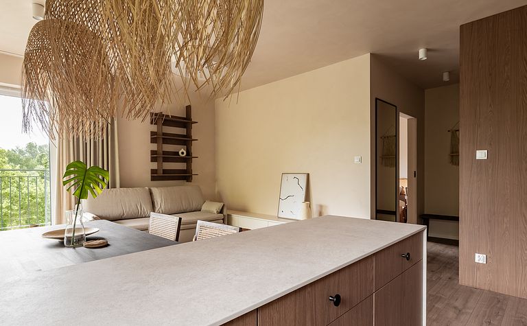 Salon z beżową sofą i drewnianym stołem