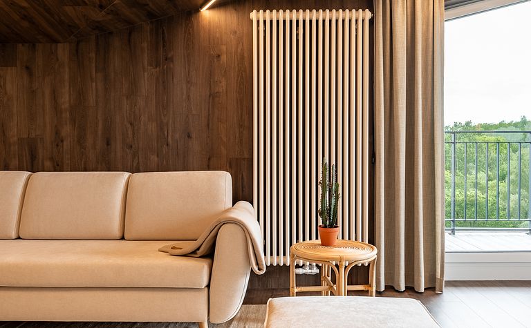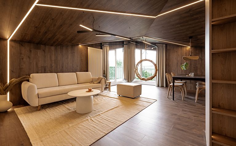 Salon z beżową sofą i drewnianą ścianą