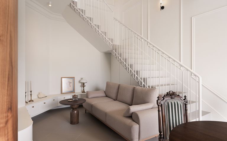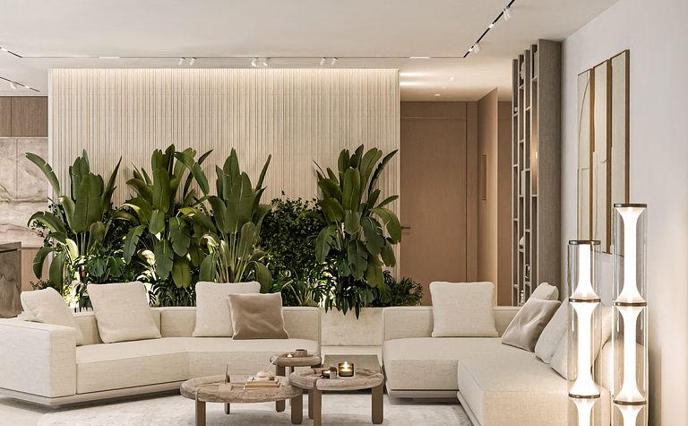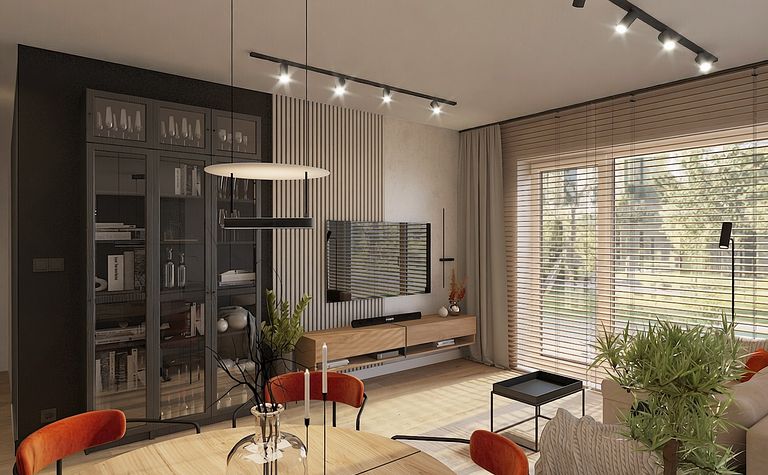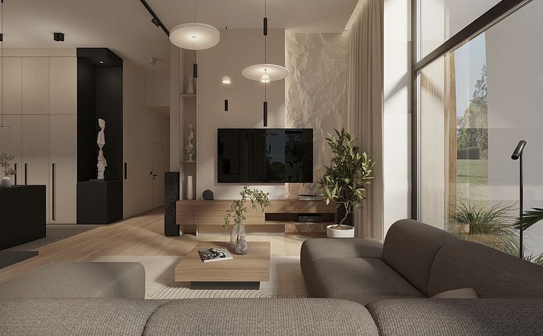 Salon z jasnymi meblami i nowoczesnym oświetleniem