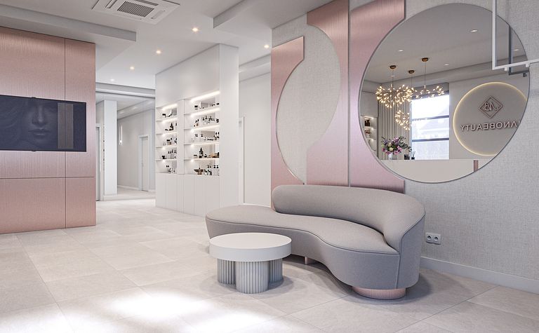 Wnętrze salonu z szaro-różową sofą i lustrem