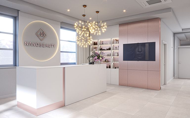 Recepcja z białym blatem i dekoracjami kwiatowymi