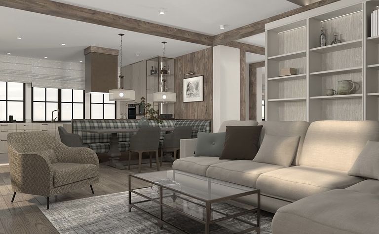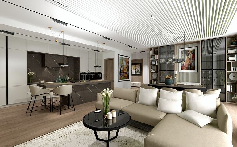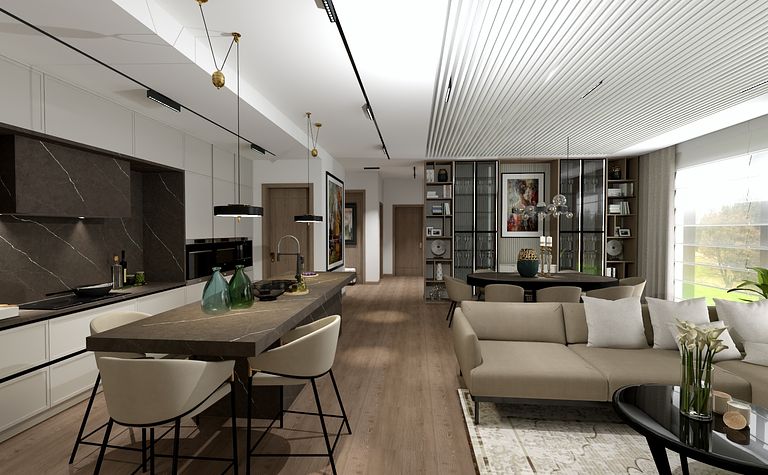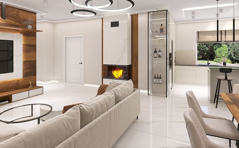 Wnętrze z jasną kuchnią i salonem