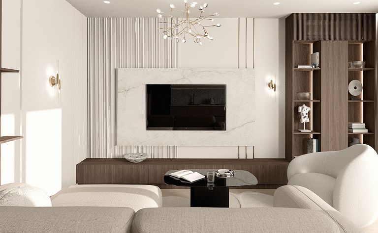 Salon z białymi meblami i drewnianymi akcentami