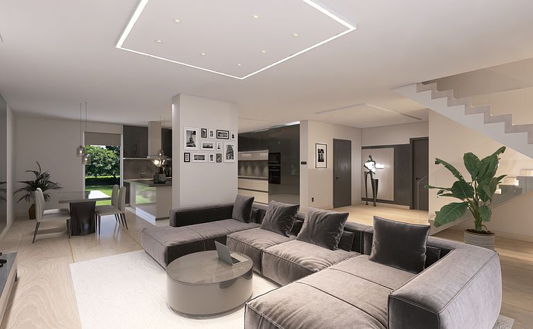 Salon z brązową sofą i nowoczesnymi schodami