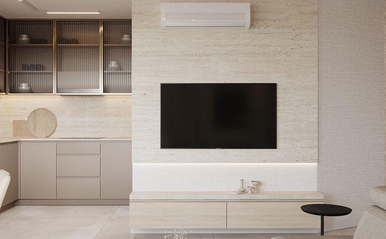 Wnętrze salonu z drewnianymi meblami i telewizorem