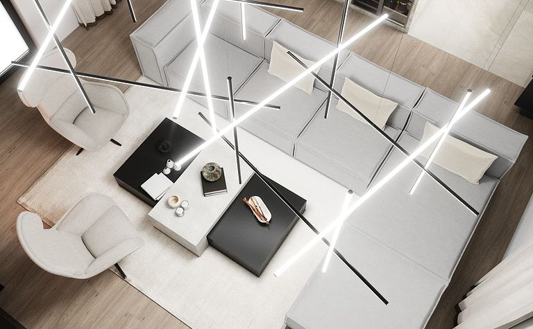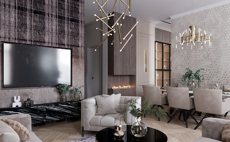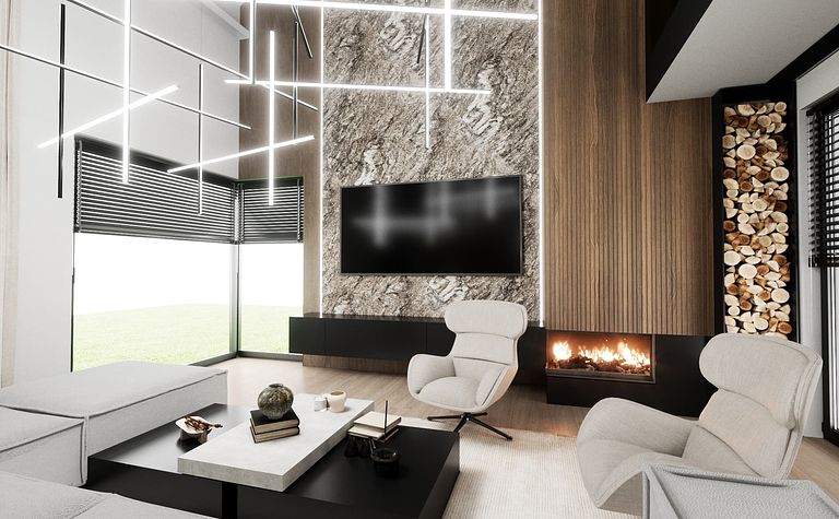 Salon z nowoczesnym oświetleniem i kominkiem