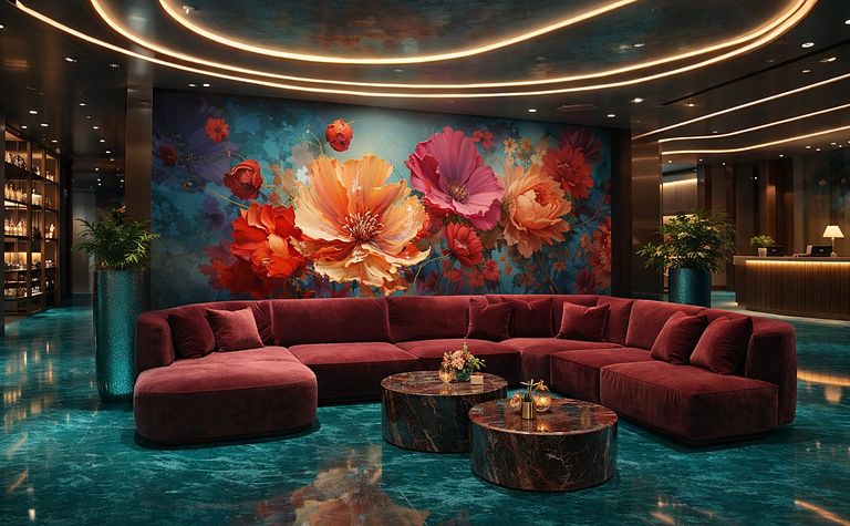 Salon z fioletową sofą i kwiatowym muralem