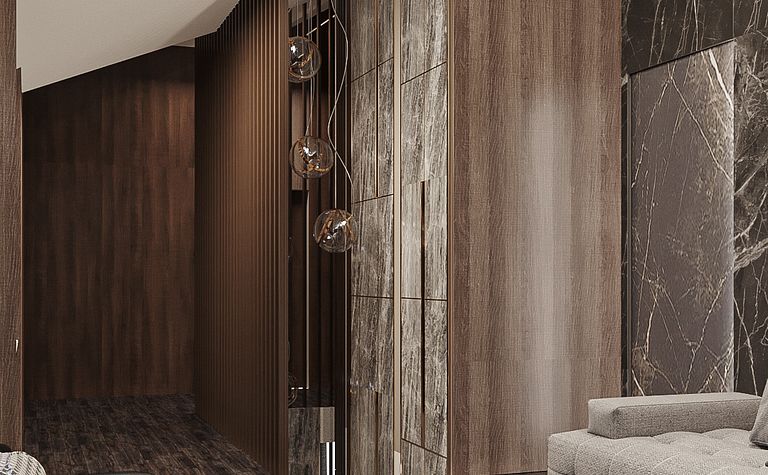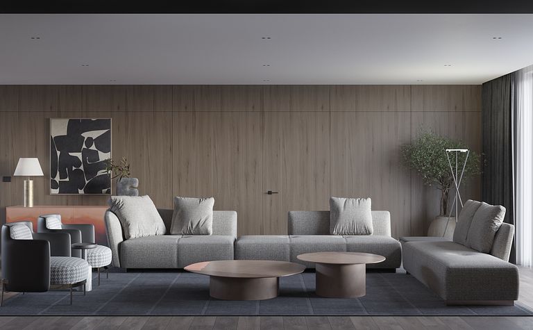 Wnętrze z szarymi ścianami i drewnianymi detalami