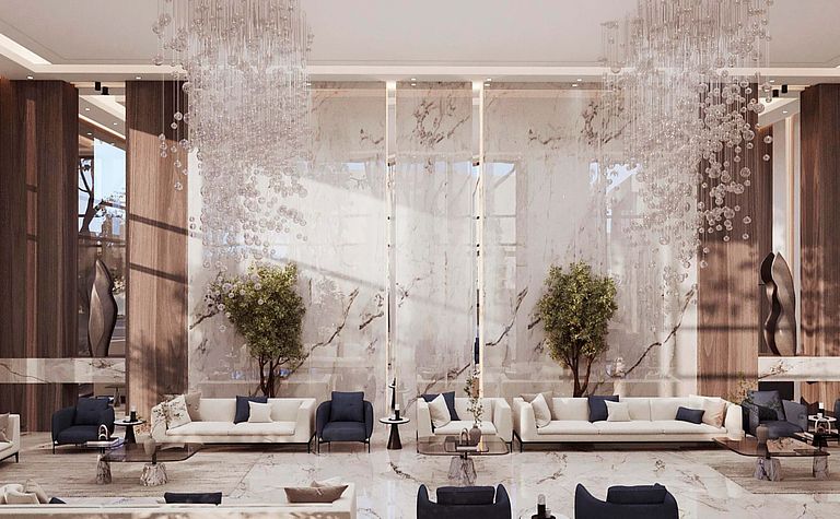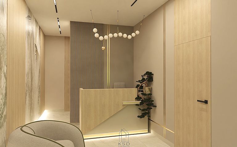 Recepcja z drewnianą ladą i jasnymi ścianami