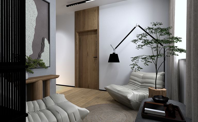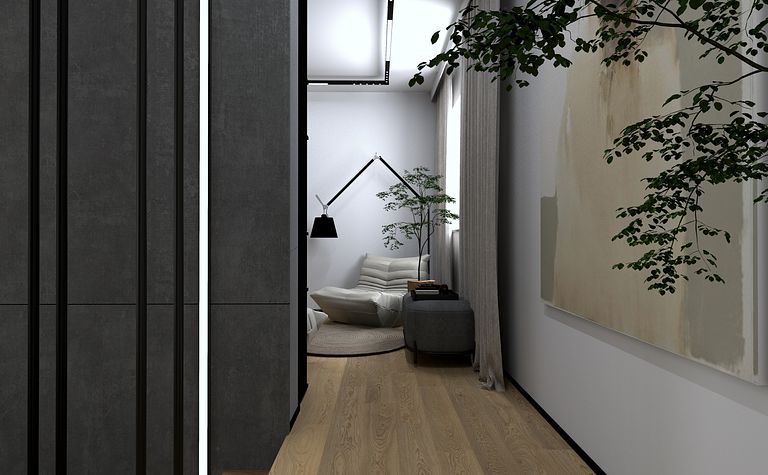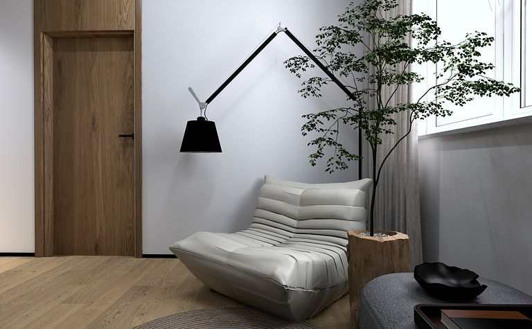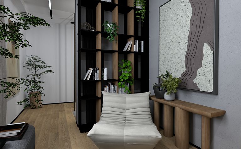 Kącik relaksacyjny z rośliną i naturalnym światłem