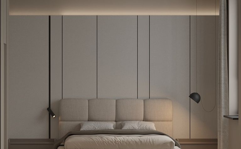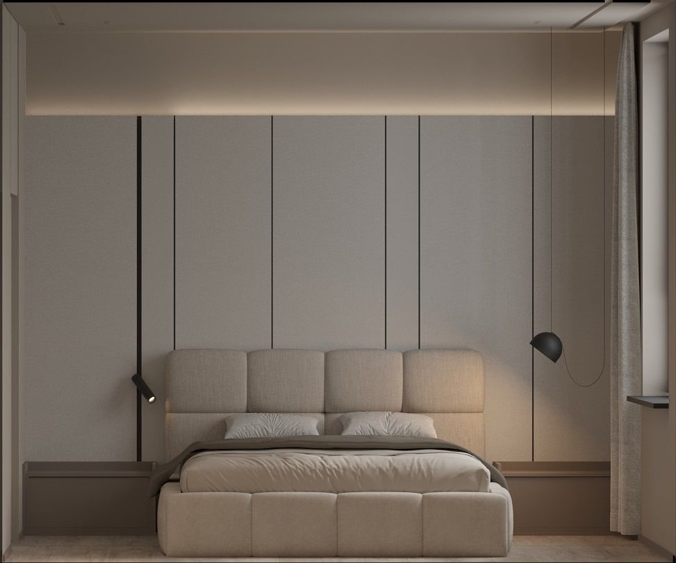 Sypialnia z beżowym łóżkiem i minimalistycznymi detalami