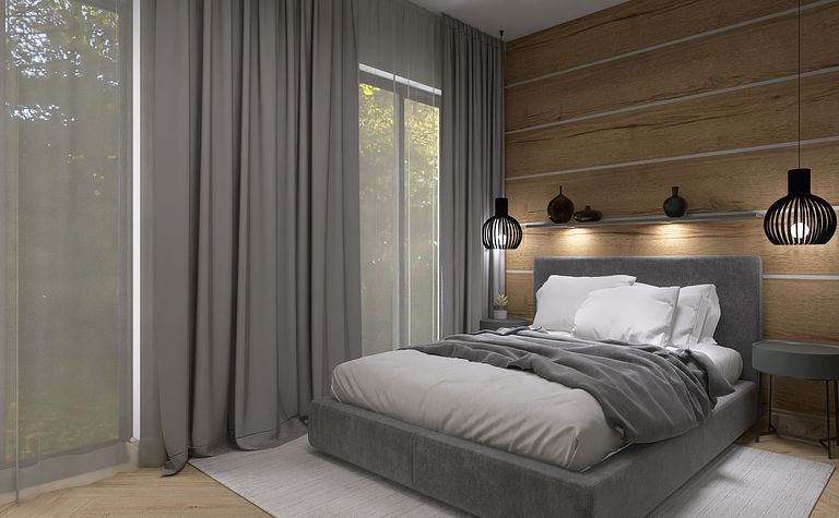Sypialnia z szarym łóżkiem i drewnianą ścianą