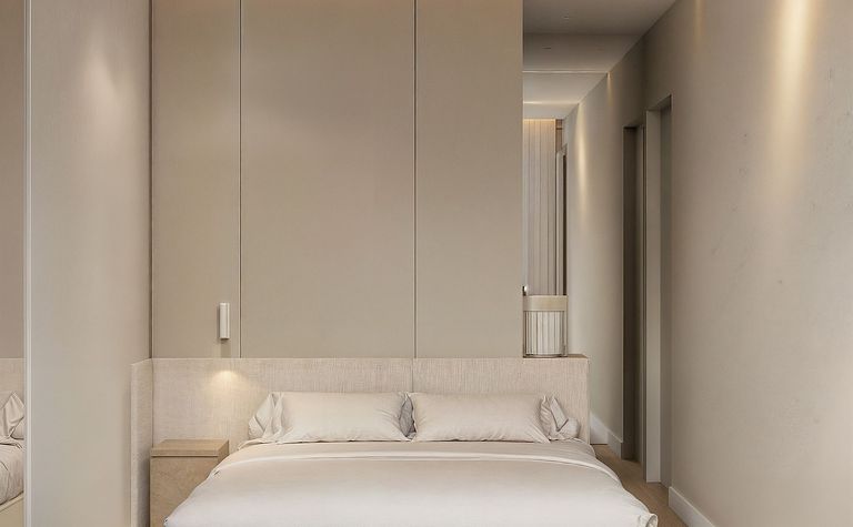 Sypialnia z beżowymi ścianami i białym łóżkiem