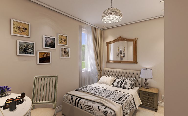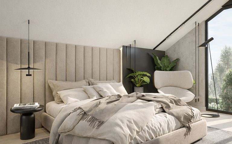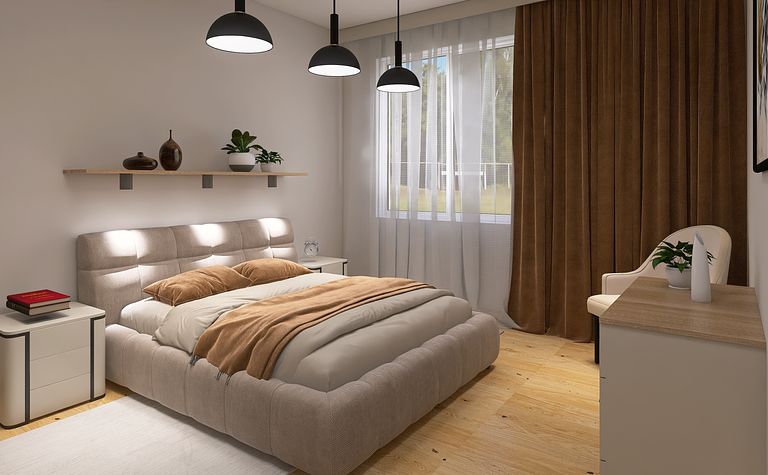Sypialnia z beżowym łóżkiem i jasnymi ścianami