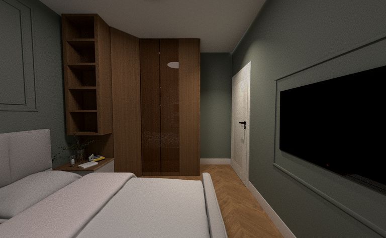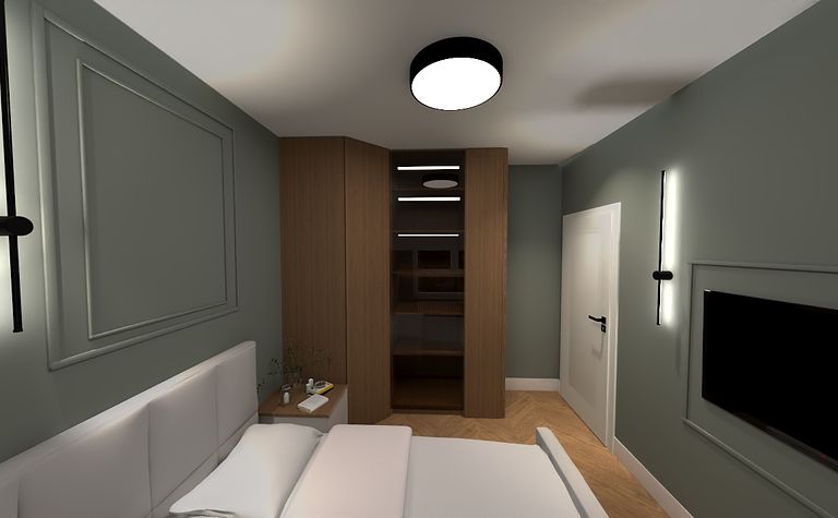 Wnętrze sypialni z szafą i jasnym łóżkiem