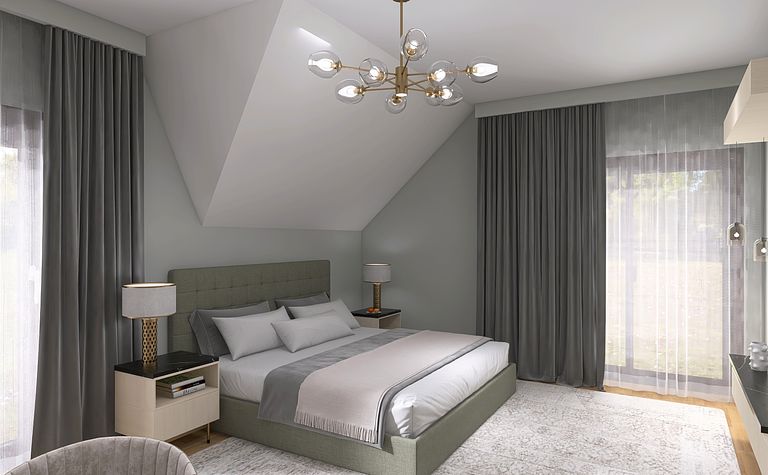 Sypialnia z szarymi zasłonami i zielonym łóżkiem