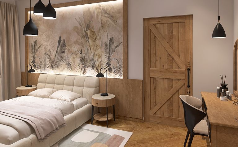 Sypialnia z drewnianymi akcentami i beżowymi elementami