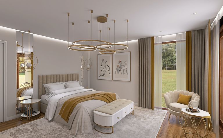 Sypialnia z beżowym łóżkiem i złotymi akcentami