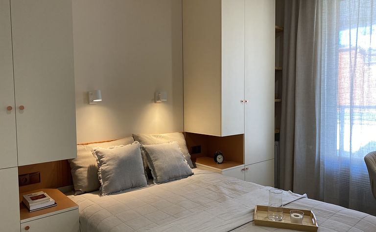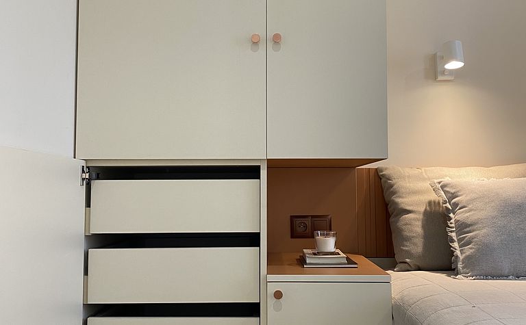 Sypialnia z łóżkiem i szafą w pastelowych odcieniach
