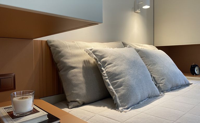 Sypialnia z beżowymi poduszkami i brązową ścianą