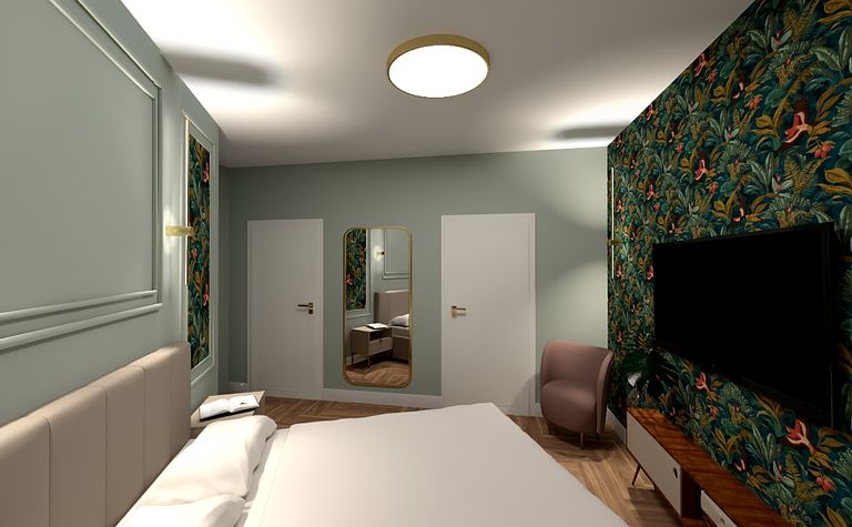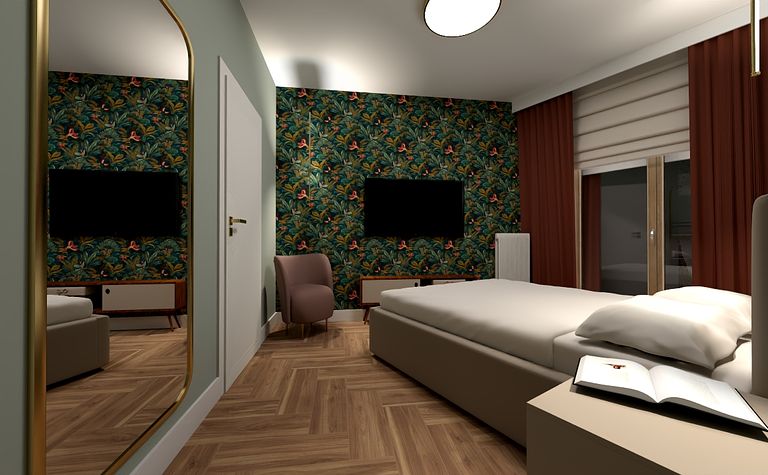 Sypialnia z kwiecistą tapetą i łóżkiem