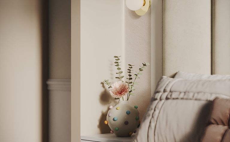 Sypialnia z beżowymi meblami i białym łóżkiem