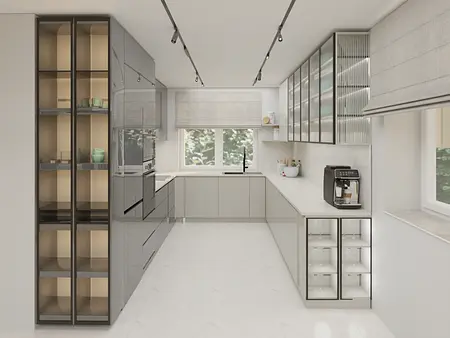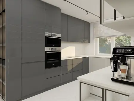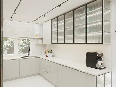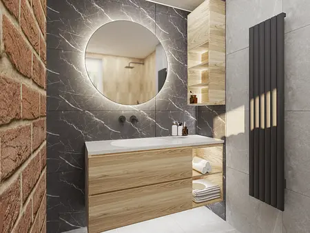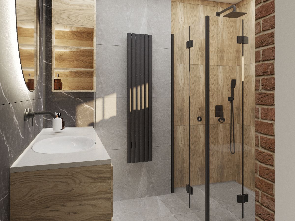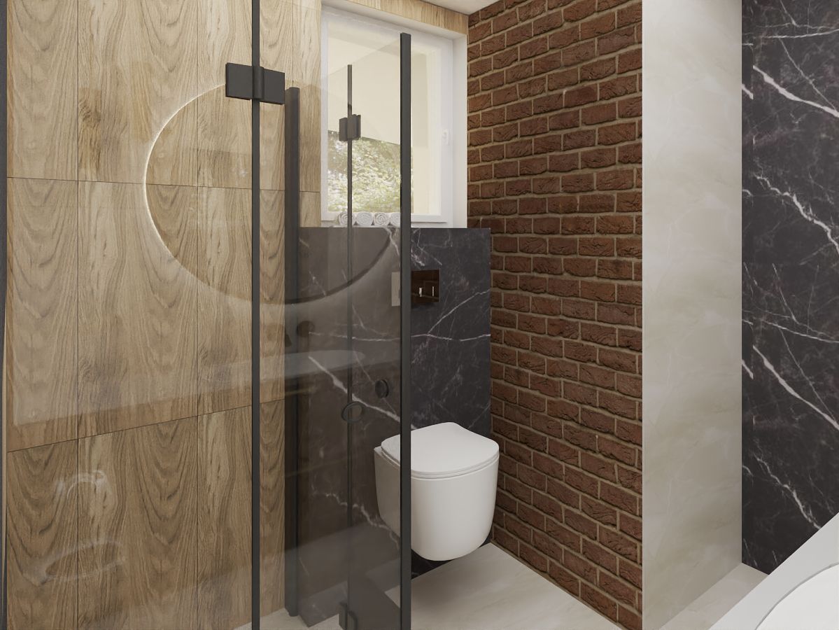 Dom dla dojrzałego małżeństwa, które chciało dla siebie stworzyć wygodną, ale nowoczesną przestrzeń . Salon i kuchnia miały być jasne i świetliste, ale łazienka, na życzeni Pana domu nieco loftowa. Ściany ozdobione licówkami ceglanymi znajdują się więc w łazience i przedpokoju. Nową łazienkę powiększyłam o część niefunkcjonalnego korytarza dzięki czemu zmieściła się kabina prysznicowa, a dom zyskał niewielki wiatrołap.