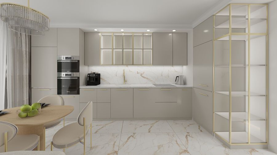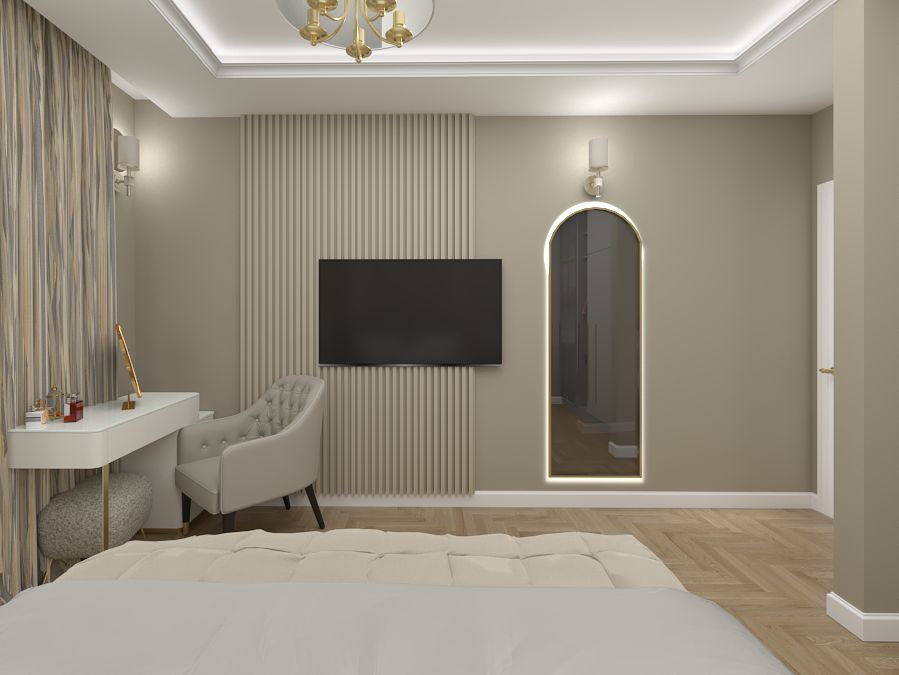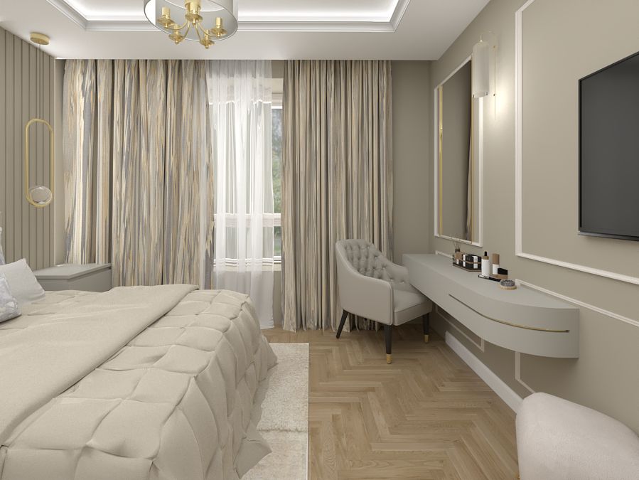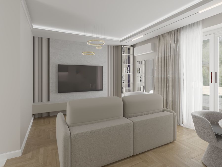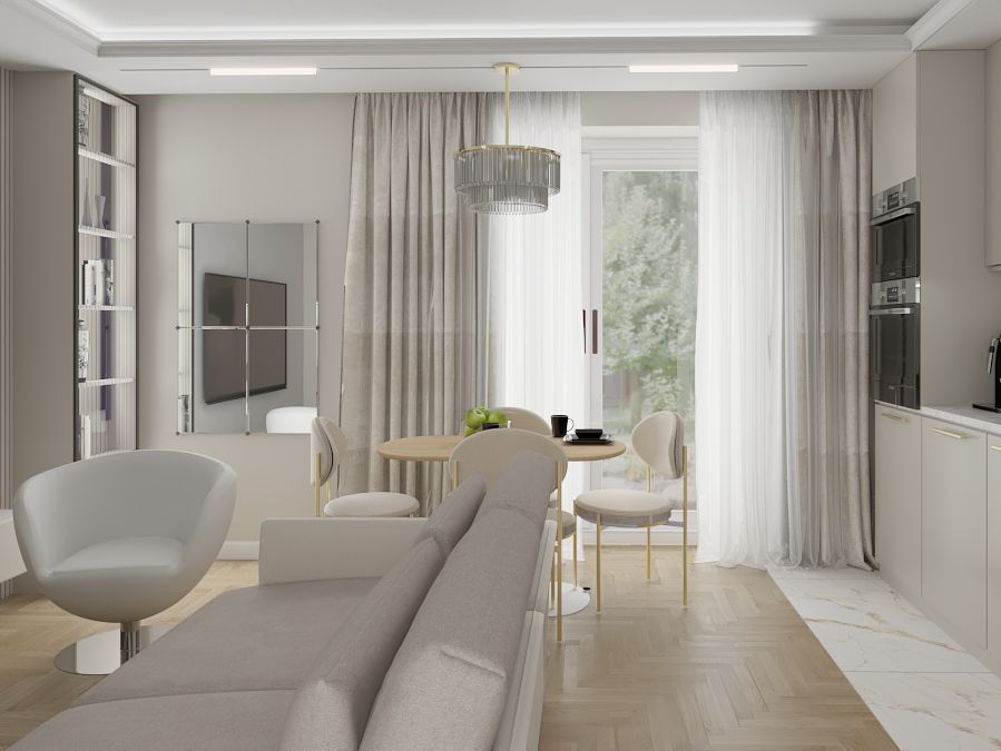 Młoda kobieta pragnęła wnętrza pełnego blasku i elegancji. Chciała by jej mieszkanie mimo niewielkiego rozmiaru dawało wrażenie wnętrze przestronnego i jasnego. Złote i połyskujące dodatki mają za zadanie dodać kobiecego akcentu i powiewu luksusu.