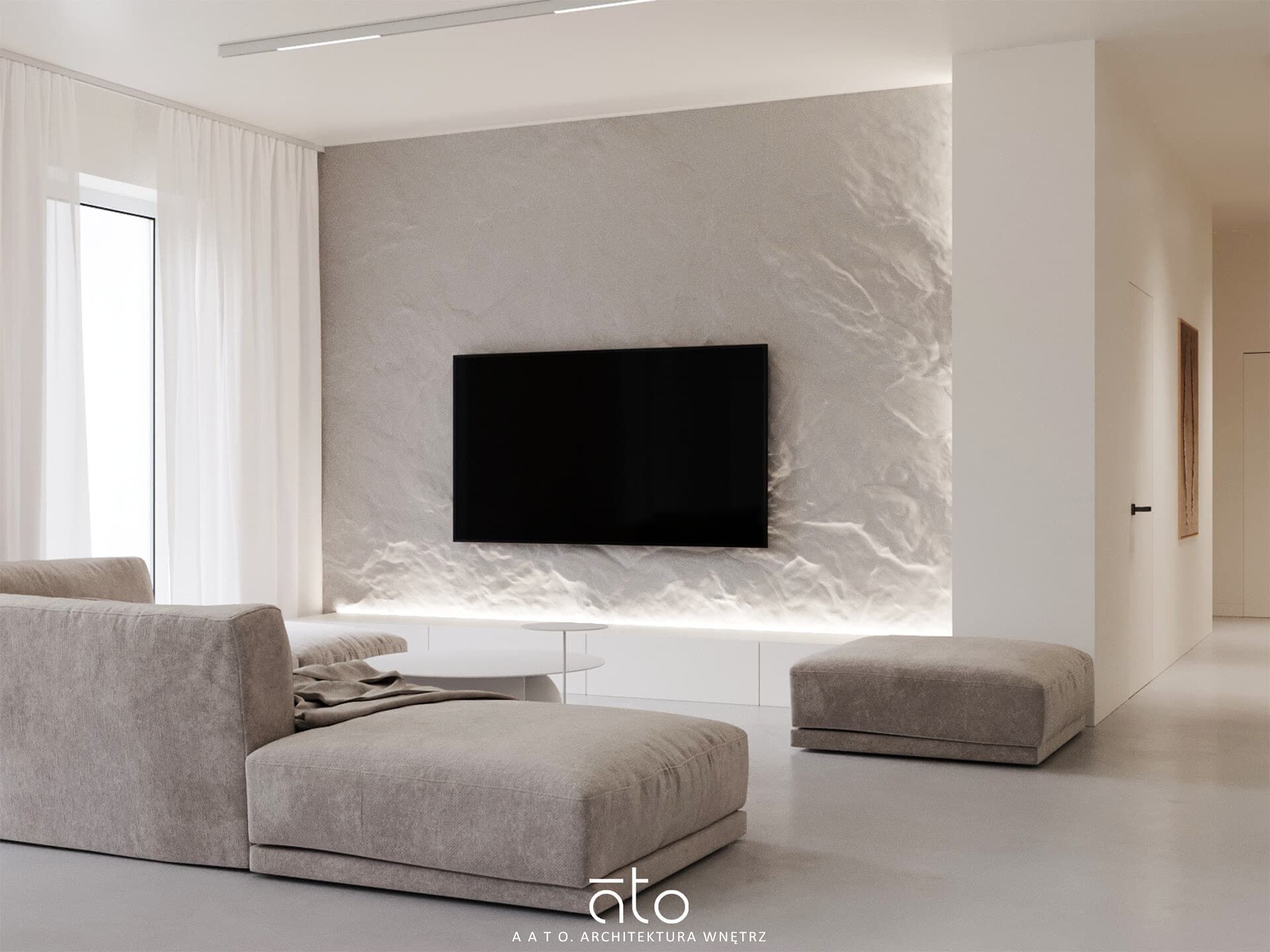 Jasny, minimalistyczny dom parterowy. Posadzki z jasnego mikrocementu, na ścianach ciekawe imitacje jasnego kamienia. Proste, minimalistyczne oświetlenie.