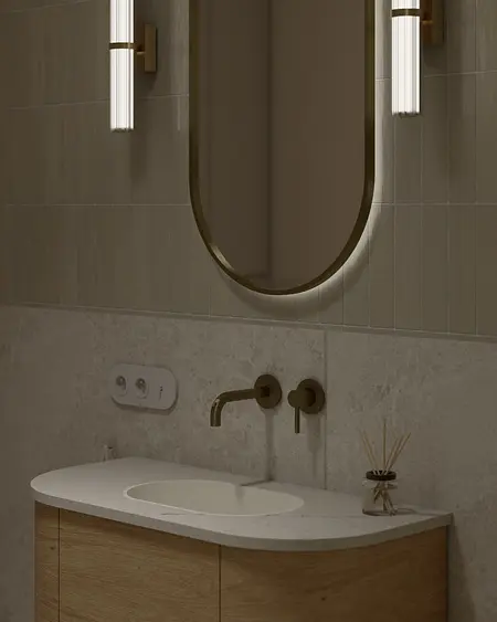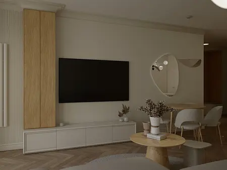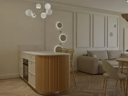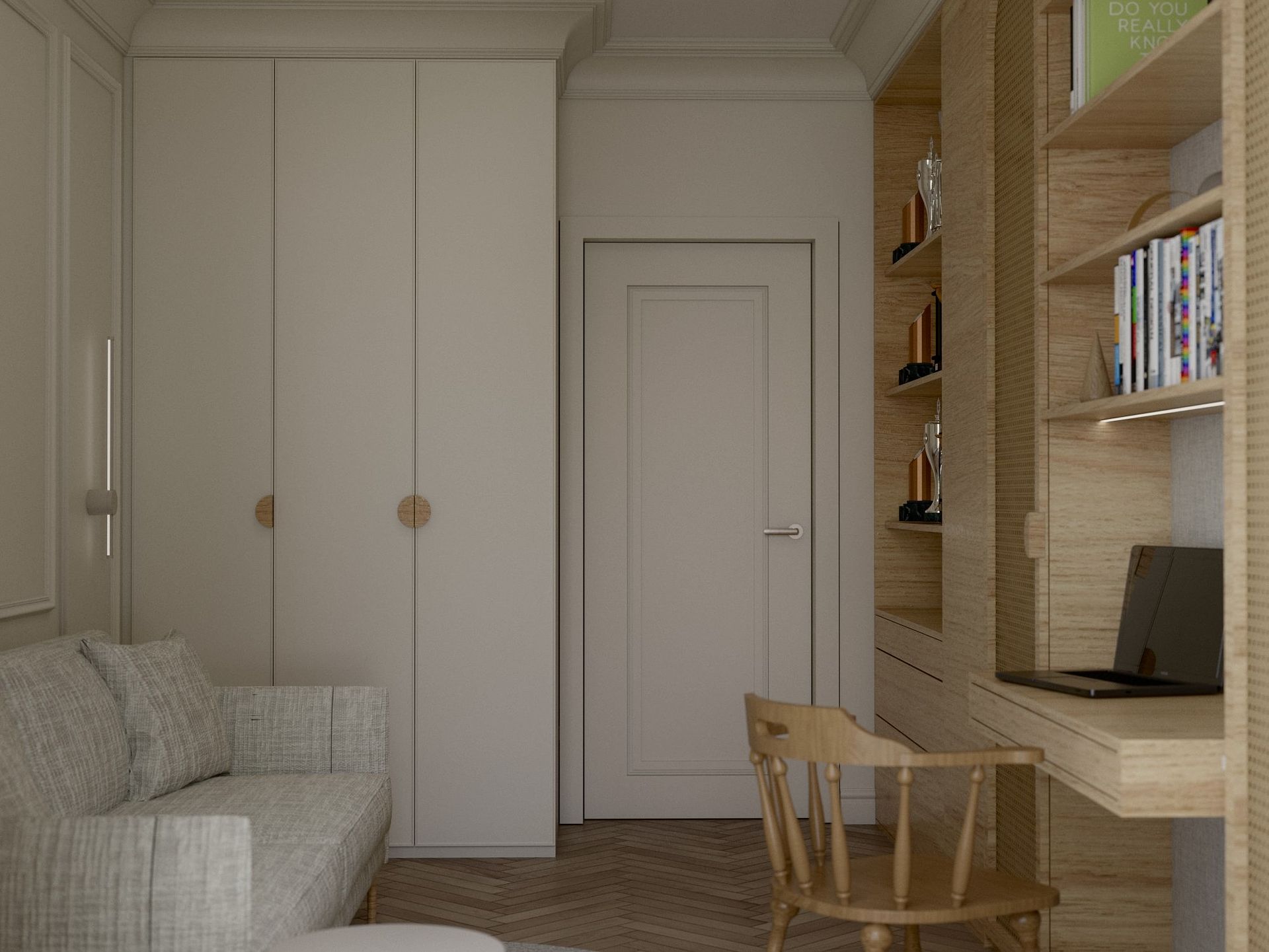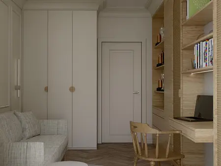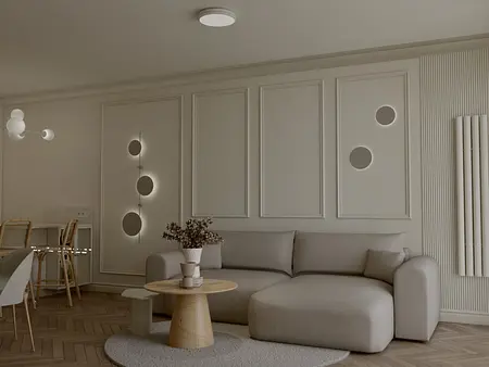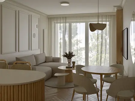 Fotorealistyczne obrazy projektowanych pomieszczeń z meblami i elementami odpowiadającymi rzeczywistym produktom.
