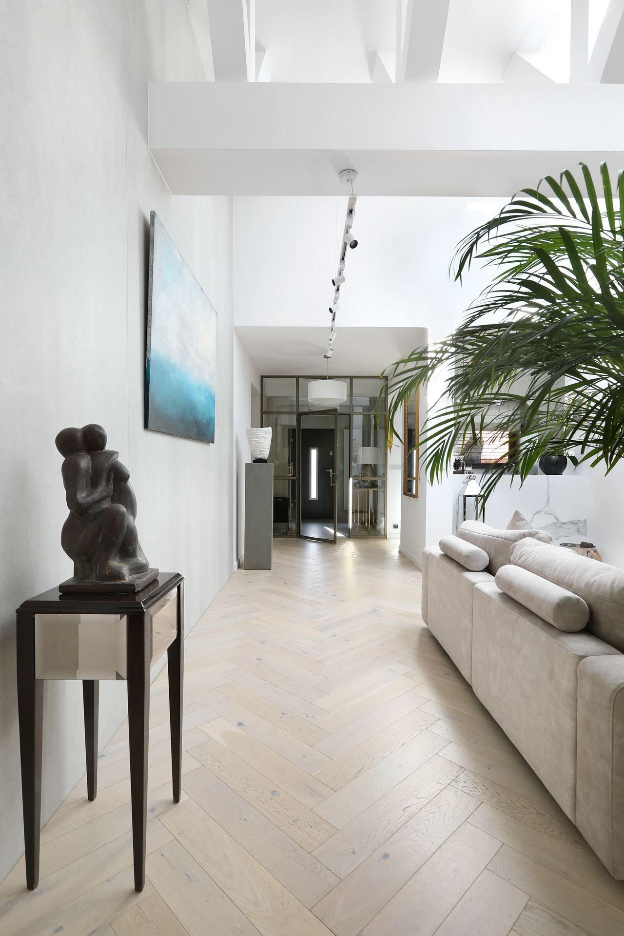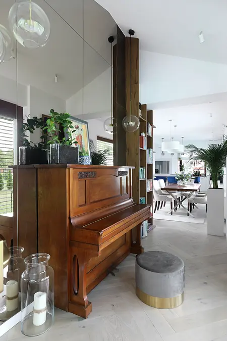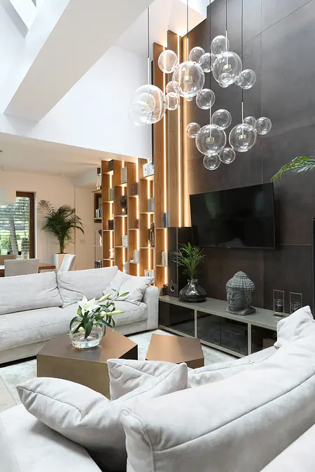 Przebudowa i rozbudowa domu pokierowała nas z inwestorami w stronę otwarcia stropu nad salonem, stworzenia ekskluzywnego wiatrołapu i działania z projektem w kierunku domu, przypominającego klimatem amerykańskie luksusowe domy na wybrzeżu.