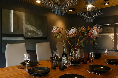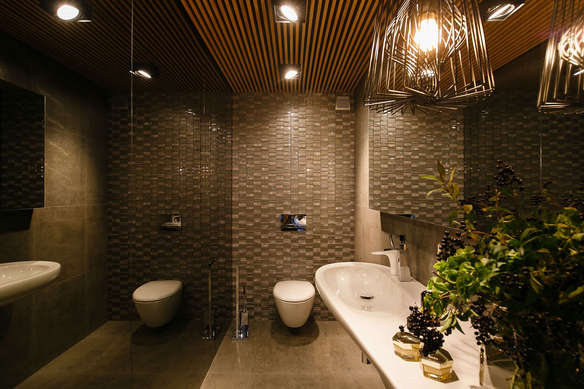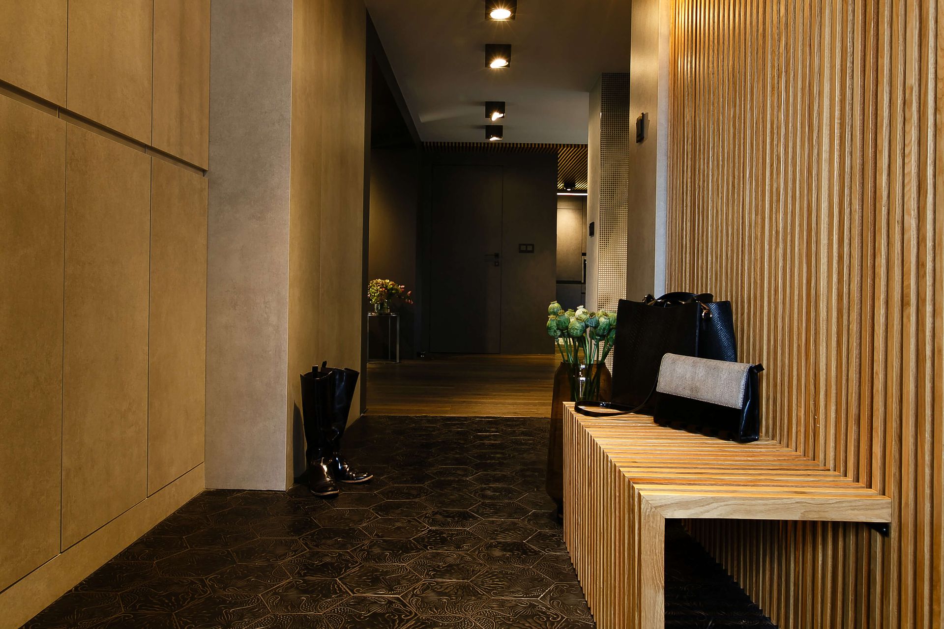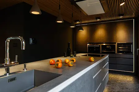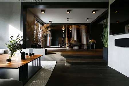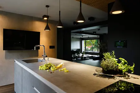 Większość ścian jest obłożona spiekami ( płyty wielkoformatowe) na podłodze deska warstwowa a w łazience mozaika i duże grafitowe lustro.