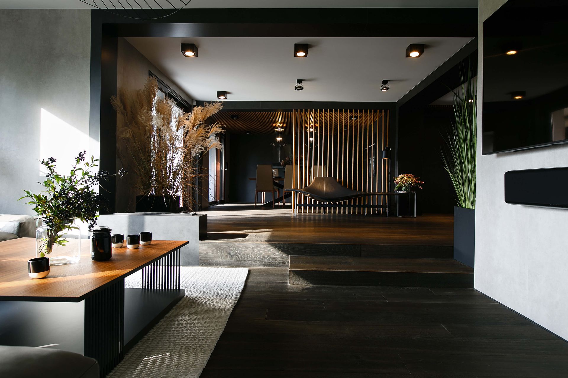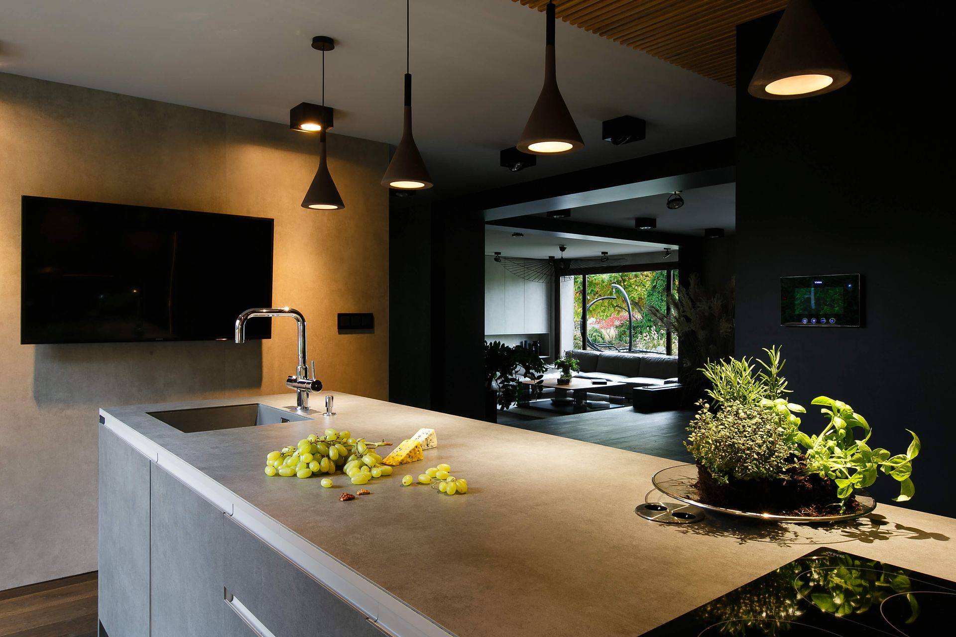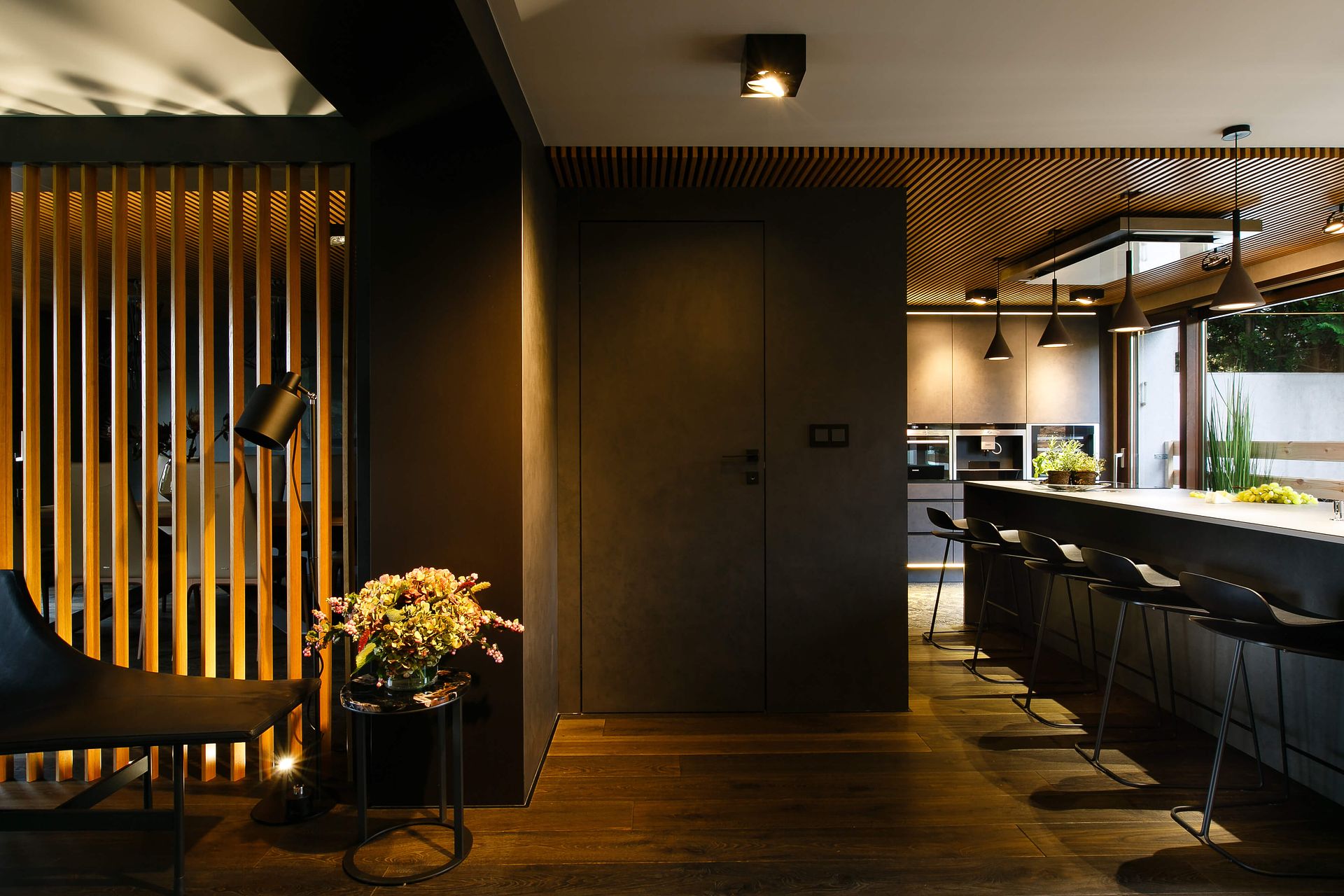 Projekt parteru domu w Krakowie, wnętrze miało być nowoczesne, klimatyczne ale też przytulne. Duża wyspą w kuchni, lamele w luksusowej formie jako ażurowa ścianka i wypełnienie sufitu.