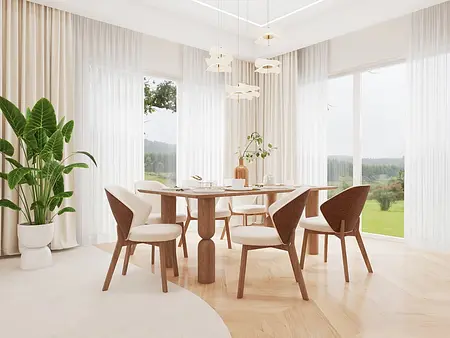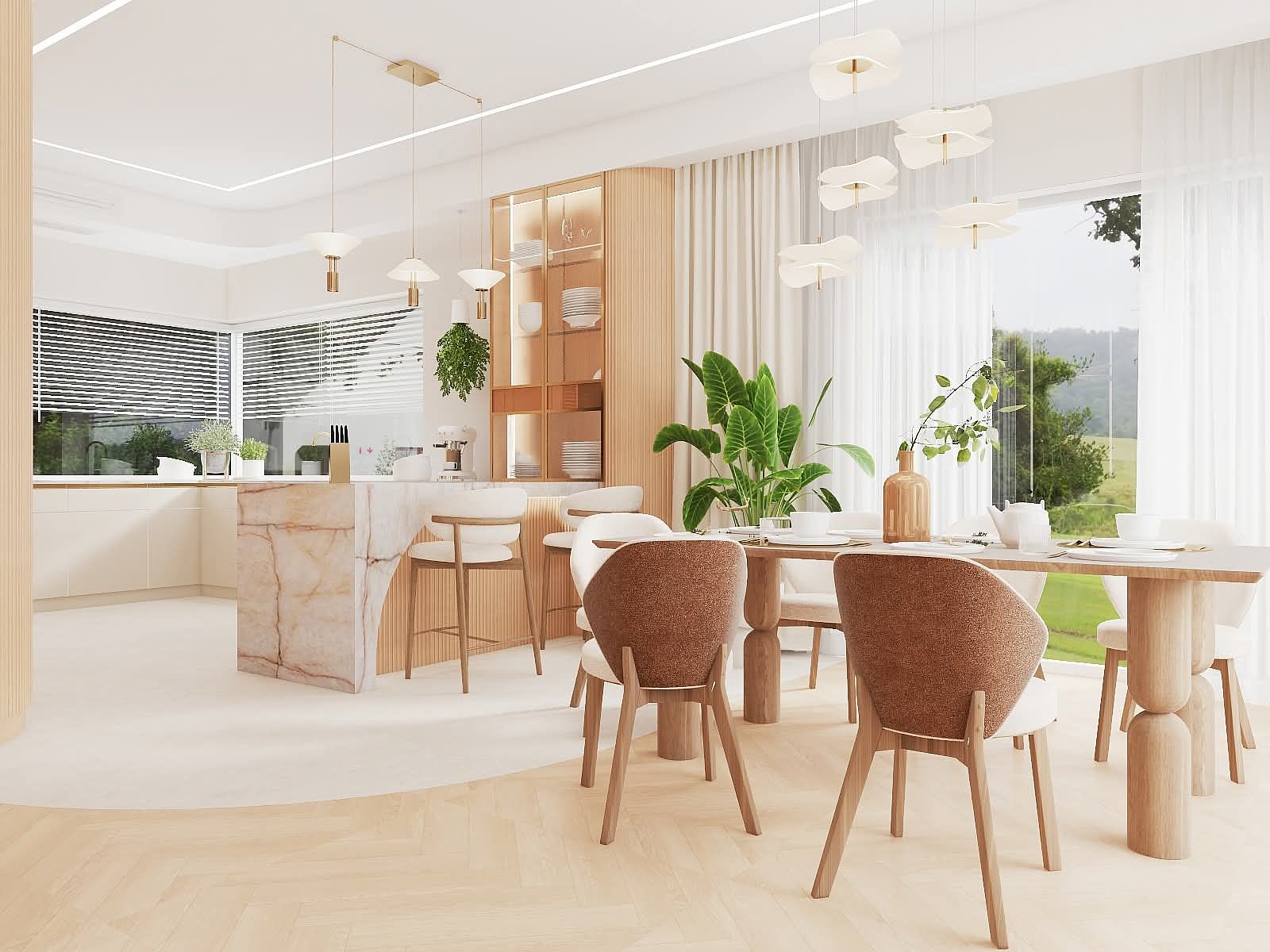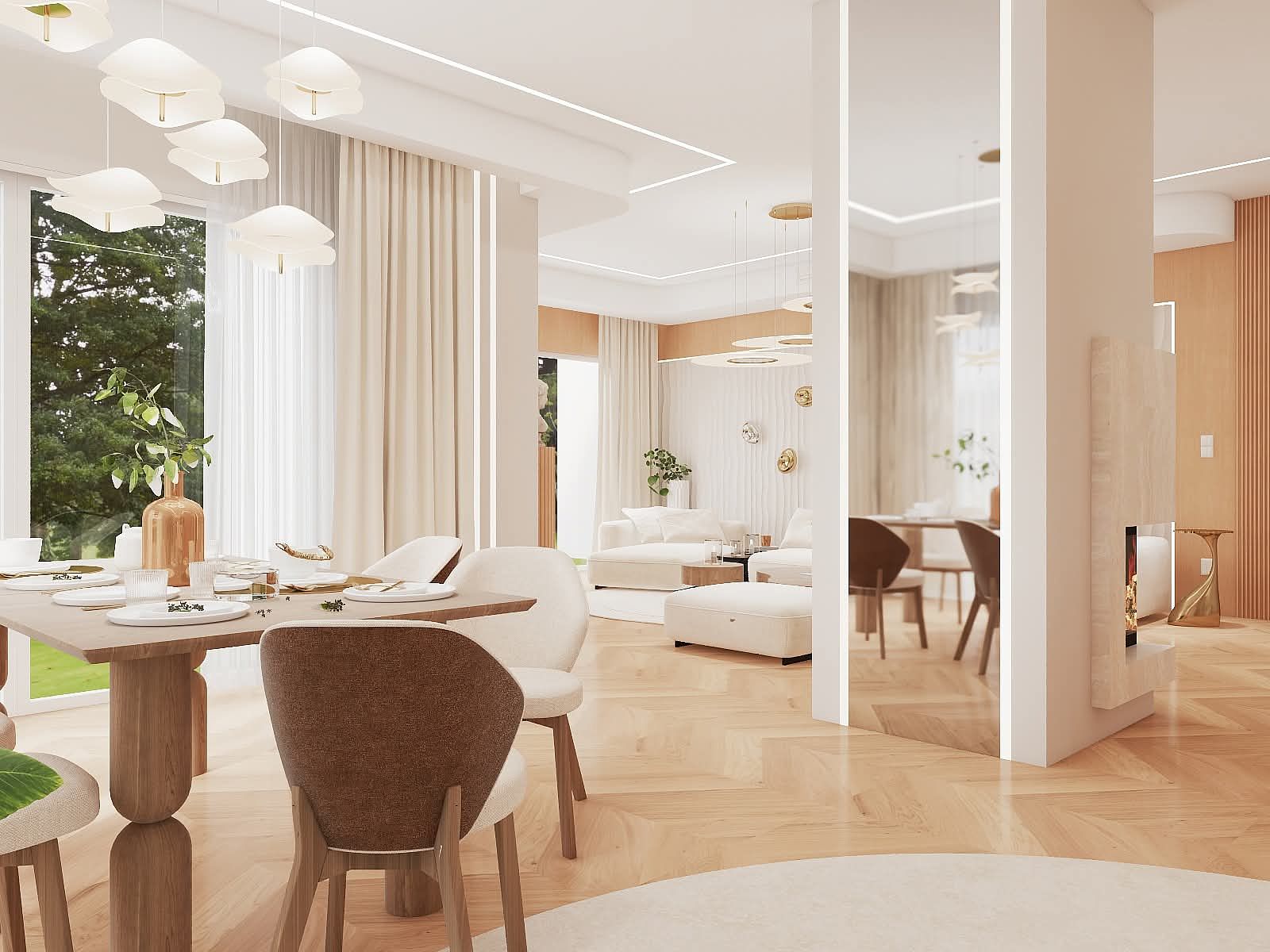 Ten projekt wnętrza to dialog między sztuką a codziennością. Estetyka japandi przenika się tu z subtelnym soft modern, tworząc przestrzeń pełną spokoju i ciepła. Ciepła paleta barw, nienachalne kompozycje oraz nietuzinkowe oświetlenie budują atmosferę harmonii, w której niebanalne formy i starannie dobrane detale nadają wnętrzu wyjątkowy charakter. To dom, w którym design staje się częścią codziennego życia.