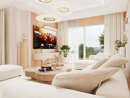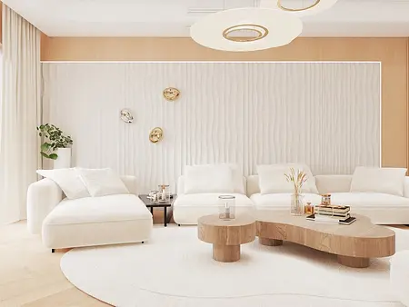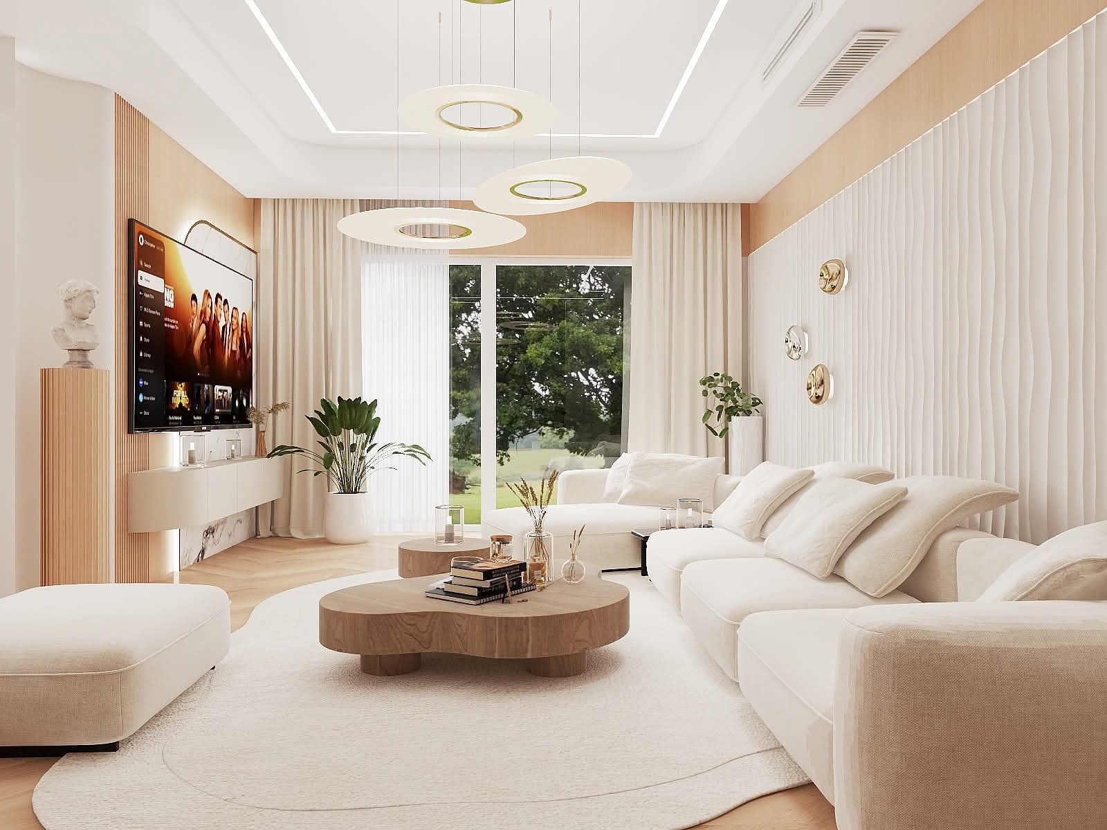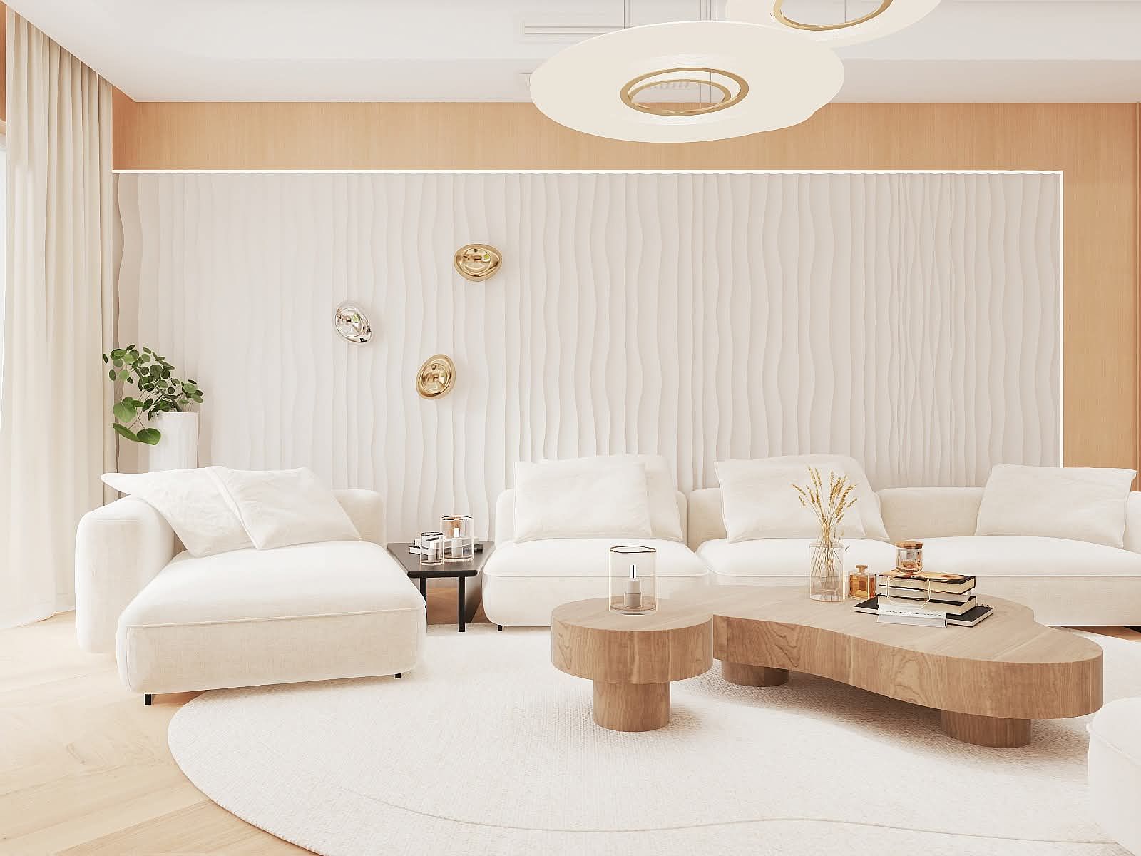 Wnętrze salonu w stylu glamour i japandi z beżową sofą, drewnianymi akcentami i nowoczesnymi detalami. 10 zdjęć w projekcie Zobacz projekt