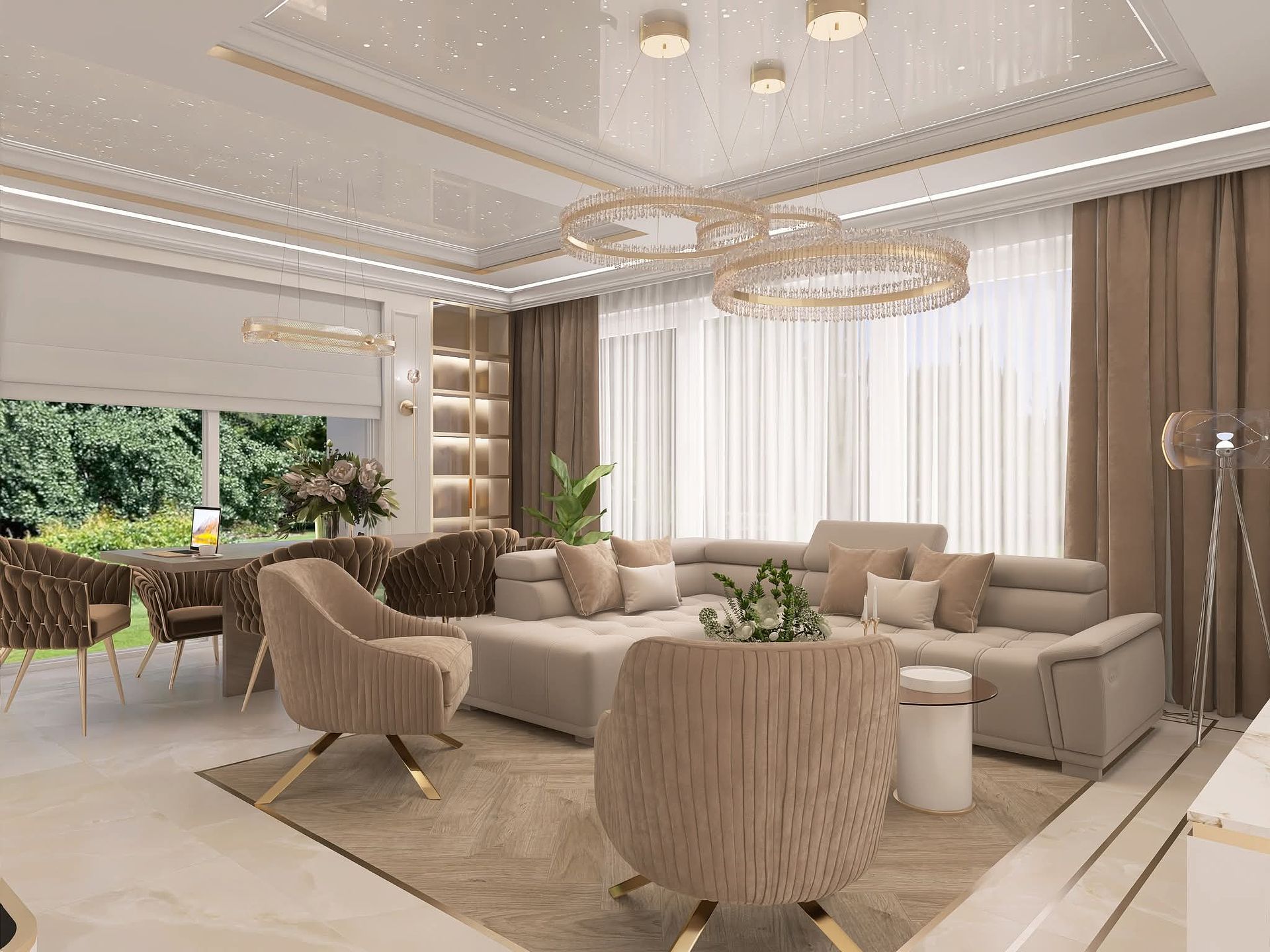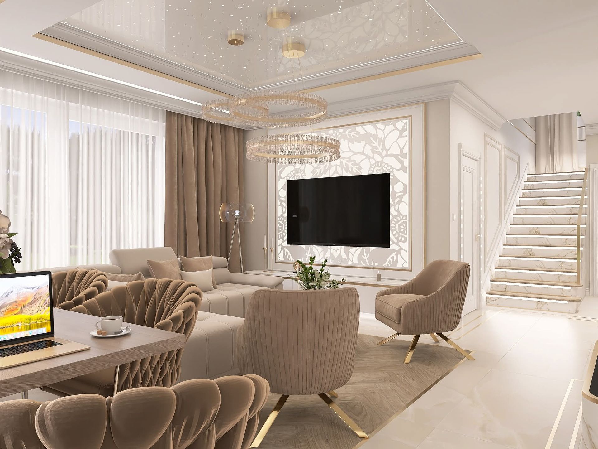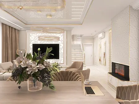 Wnętrze salonu w stylu glamour i japandi z beżową sofą, drewnianymi akcentami i nowoczesnymi detalami. 10 zdjęć w projekcie Zobacz projekt